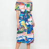 A printed woven dress featuring off shoulder neckline, short sleeves, elasticizied waist with self sash tie and button down front