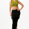 Knitted rayon spandex. Sleeveless. Cool print. Long skirt with pockets. Silted & rusched